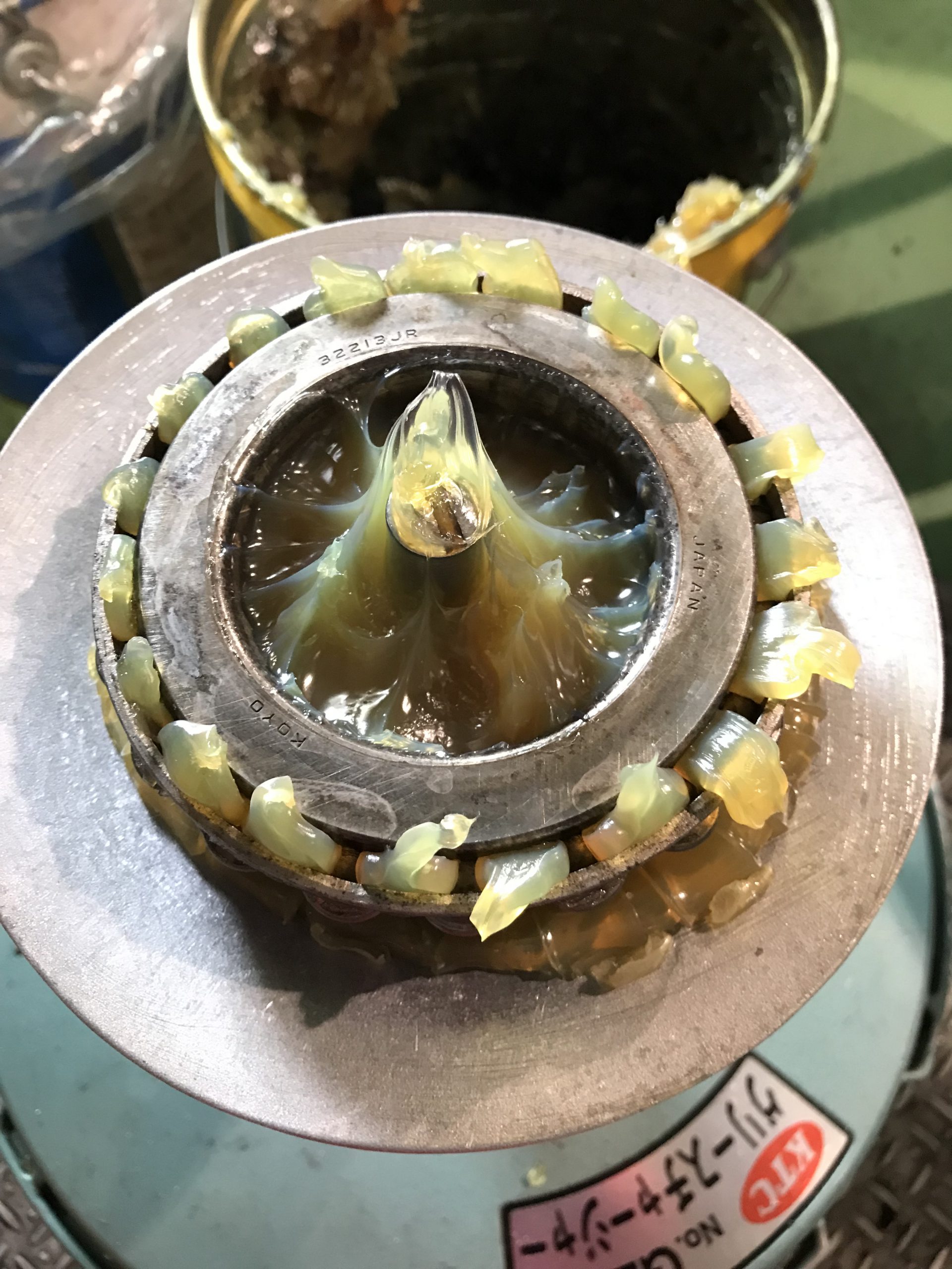 洗浄後のベアリング この段階でベアリングローラーなどに傷がないか確認し、ベアリンググリス充填機でローラーの内部まで新しいグリスを充填します。
