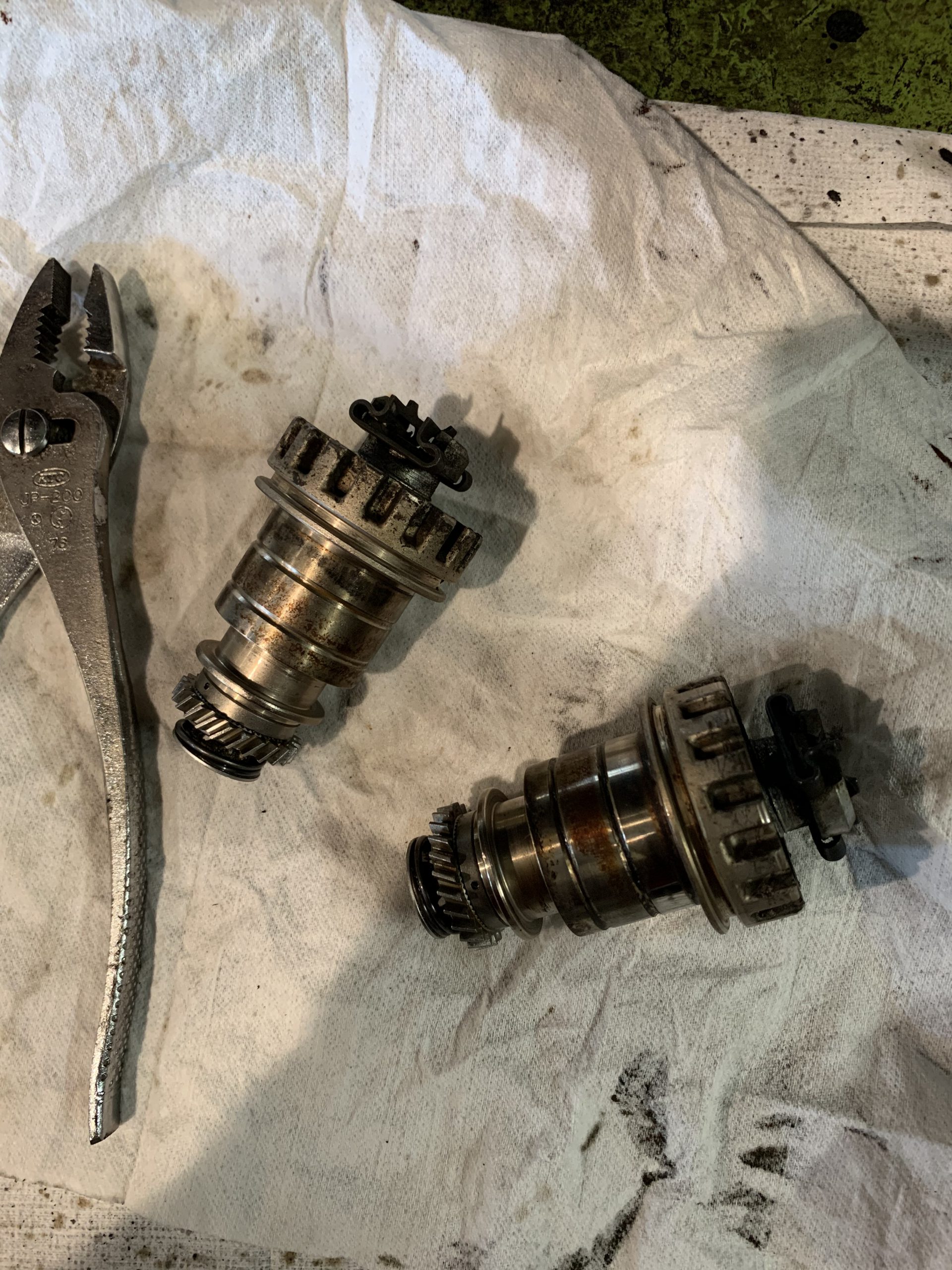 外したピストンと錆の出たホイルシリンダ内部の写真。