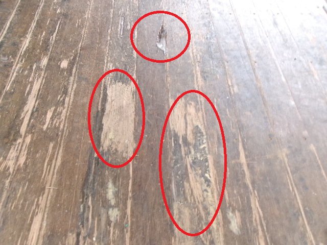 ① 全体の床が傷んでいますが、今回はその中でも損傷がひどい床板の部分修理をしていきます。