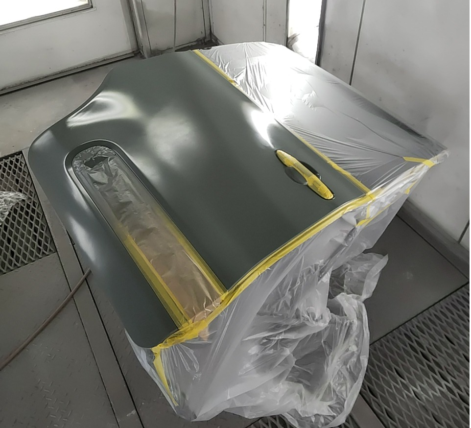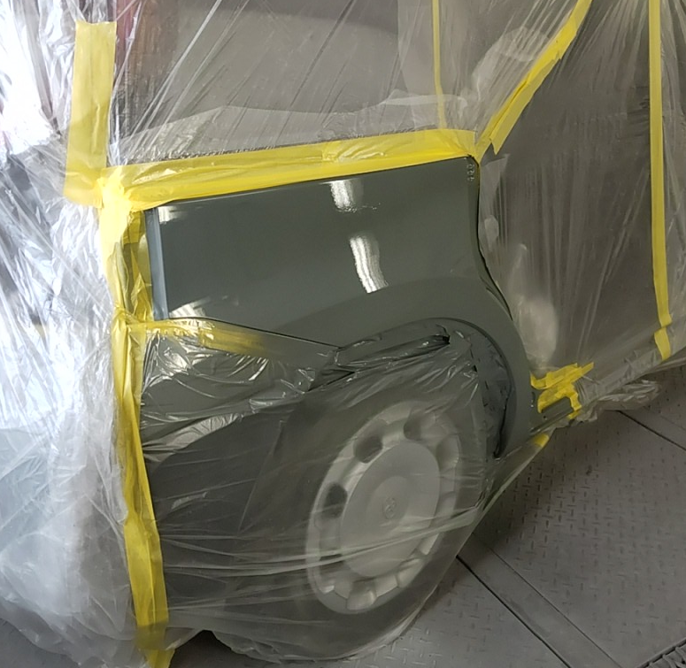 ②塗装ブースに車を移動させ、全体をマスキングし塗装開始。