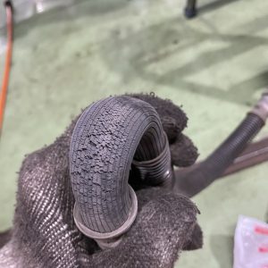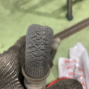 フロントのブレーキホースはハンドル切った時に動くようにたわみが大きくあるので良くヒビなどがみられるので要チェックです。