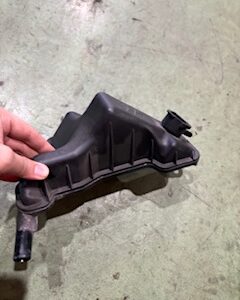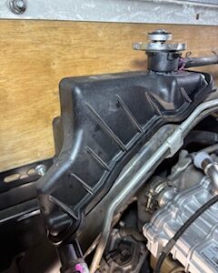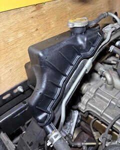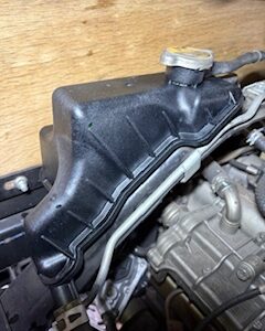 3ヶ月点検でご入庫したお車なのですが、サブタンクの水が減ってたので何処からか水漏れしてるかもと、詳しく点検してみるとエンジンの右前から垂れていて、濡れている箇所を辿っていくと、エンジンの右後ろ上のリザーブタンクの裏側から漏れている事がわかりました。